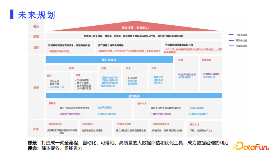 房子图中愿景以下分别是目标、抓手和支撑层。图中可以看到,支撑层的完成度更高,因为这层是一个基础。抓手层的两大块分别是健康分和通知机制,这两块已经实现了部分功能,已经能够初步形成治理的闭环,接下来我们会继续围绕健康分把质量、安全和标准这部分做好。通过围绕着健康分把数据治理的工作运营好,形成一个从问题发现到快速治理的高效闭环,来保证数据使用的效率、质量和安全,充分发挥数据价值。