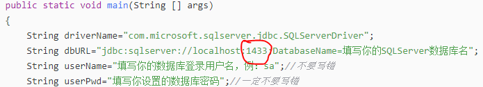 - String userName="填写你的数据库登录用户名,例:sa";//不要写错