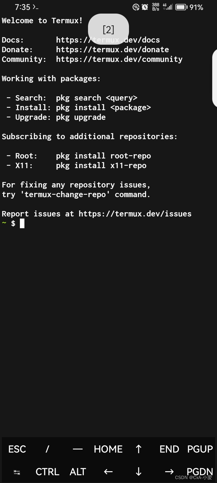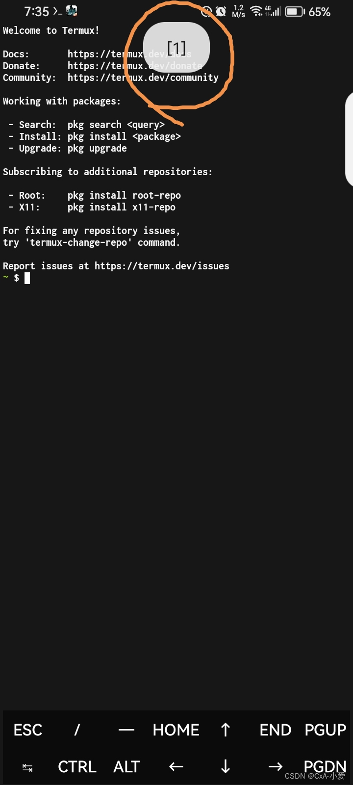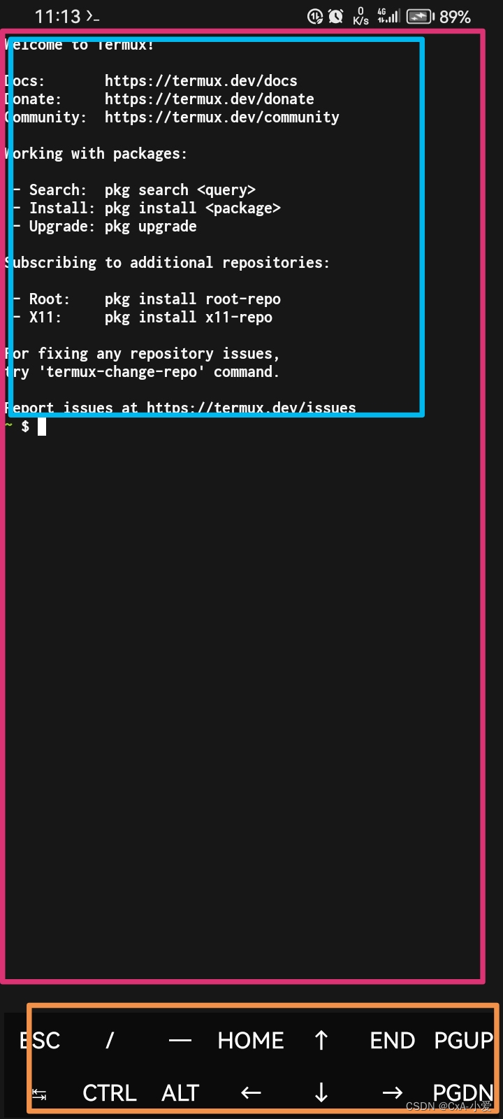 复制代码 在最底下的橙色框框中是termux的工具栏,内里包罗了电脑上的esc,ctrl,alt,等按键,可以更简朴的控制下令的输入和执行