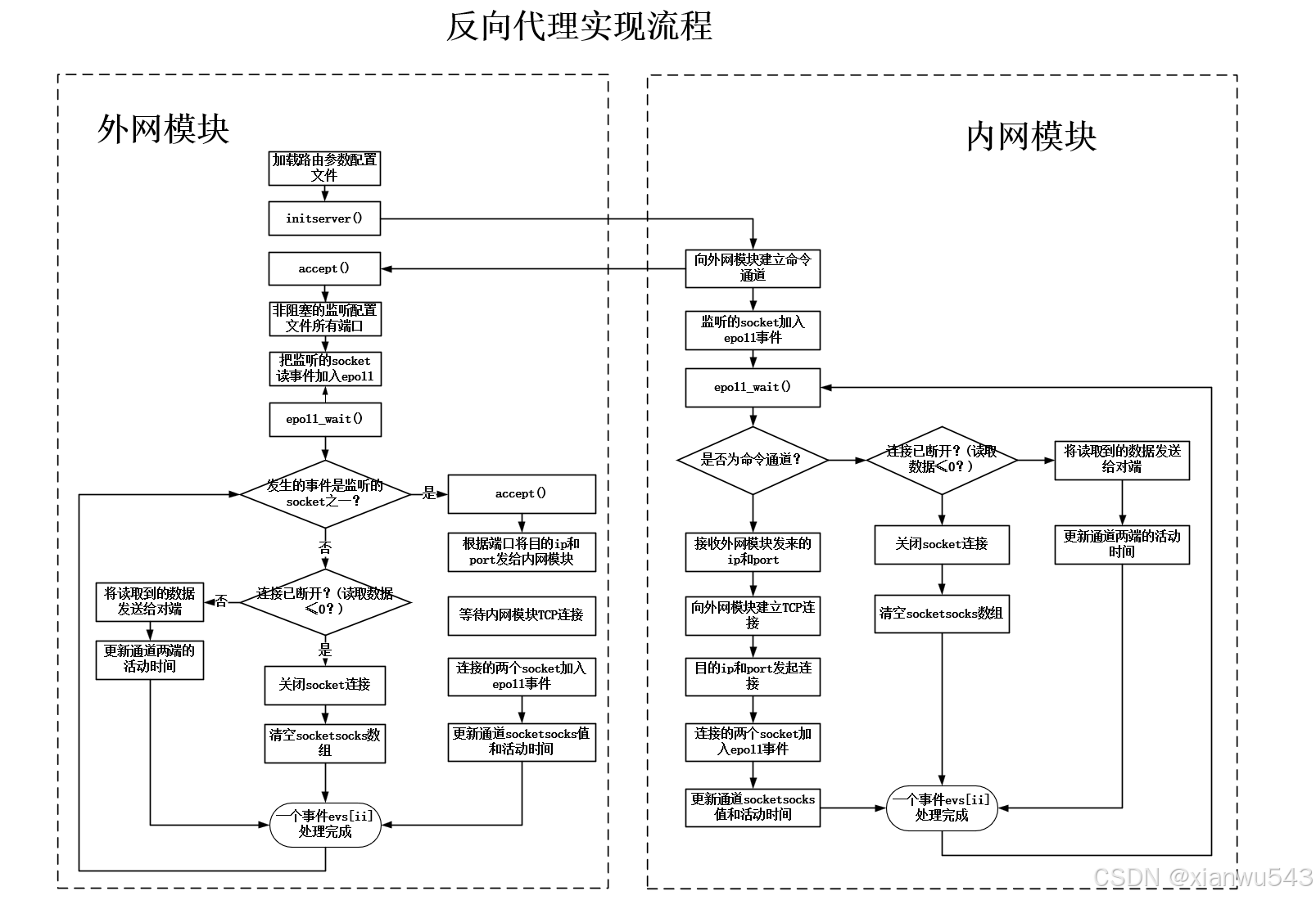 - 此时,内网模块与外网模块都进入事件循环,外网程序监听着路由配置文件的端口可以开始担当用户客户端的毗连请求了;内网程序epoll中只有下令通道的socket,内网程序也做好了准备接收外网程序的下令。