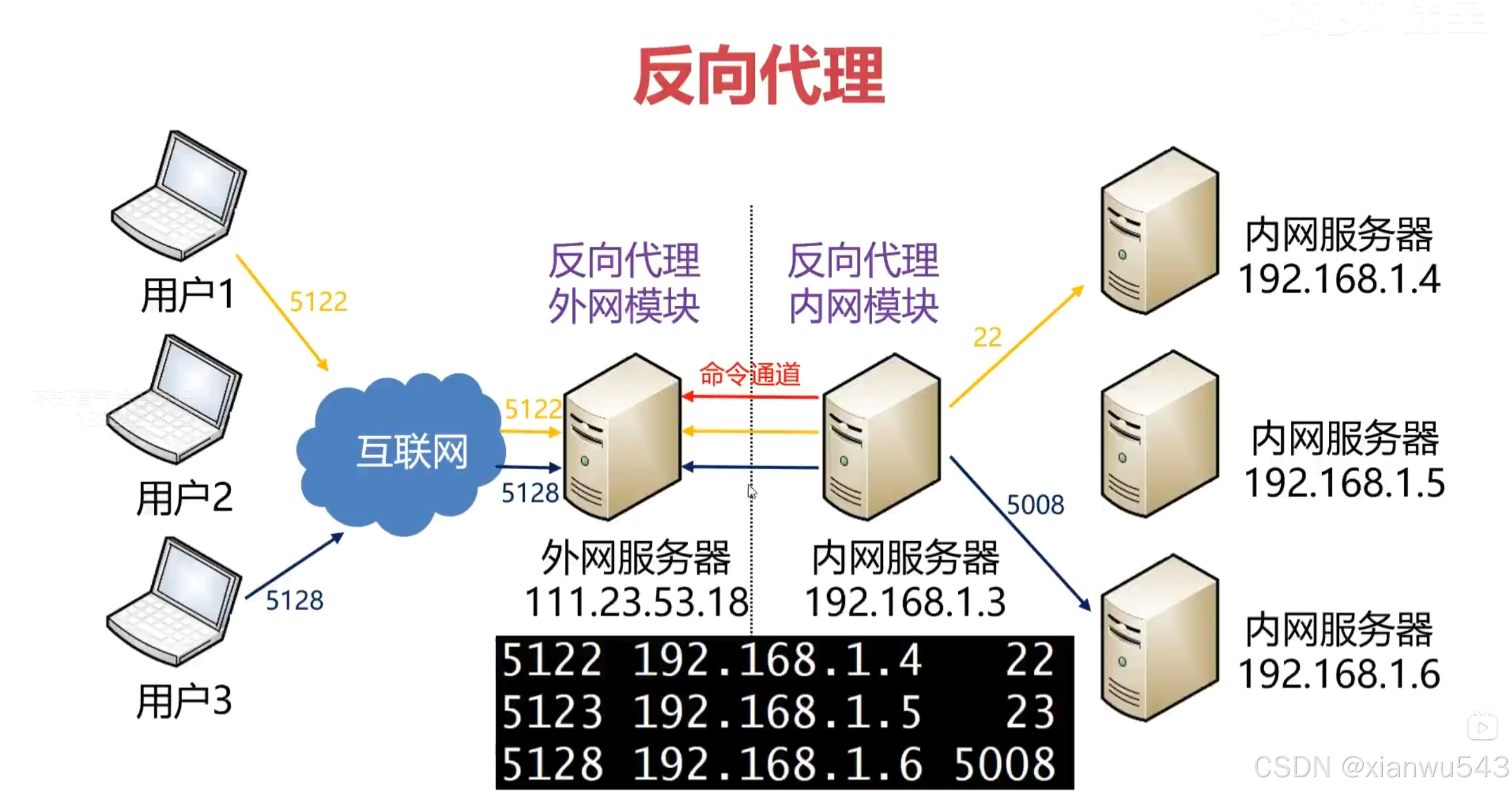- 用户1毗连了外网服务器的5122端口,外网模块通过下令通道告诉内网模块帮我连192.168.168.1.4的22端口;