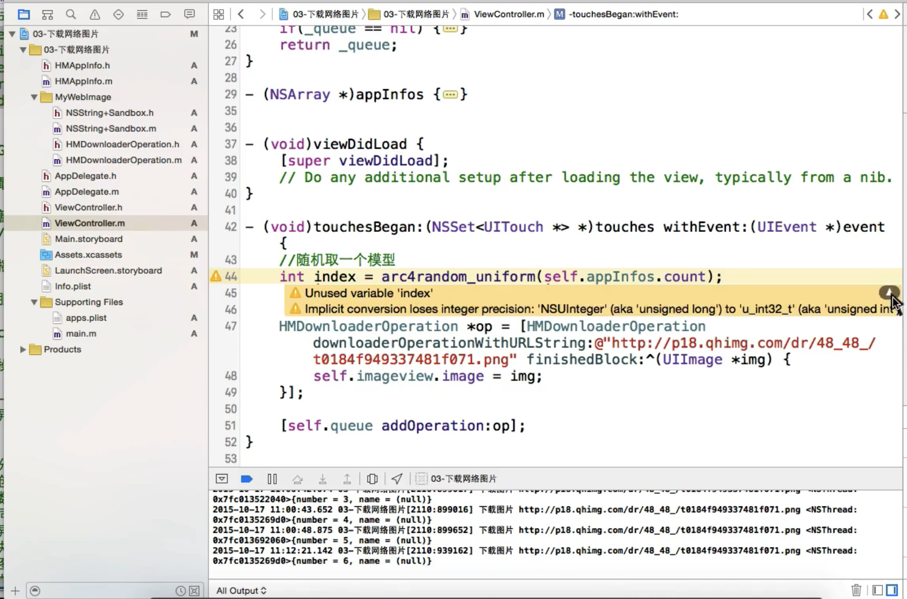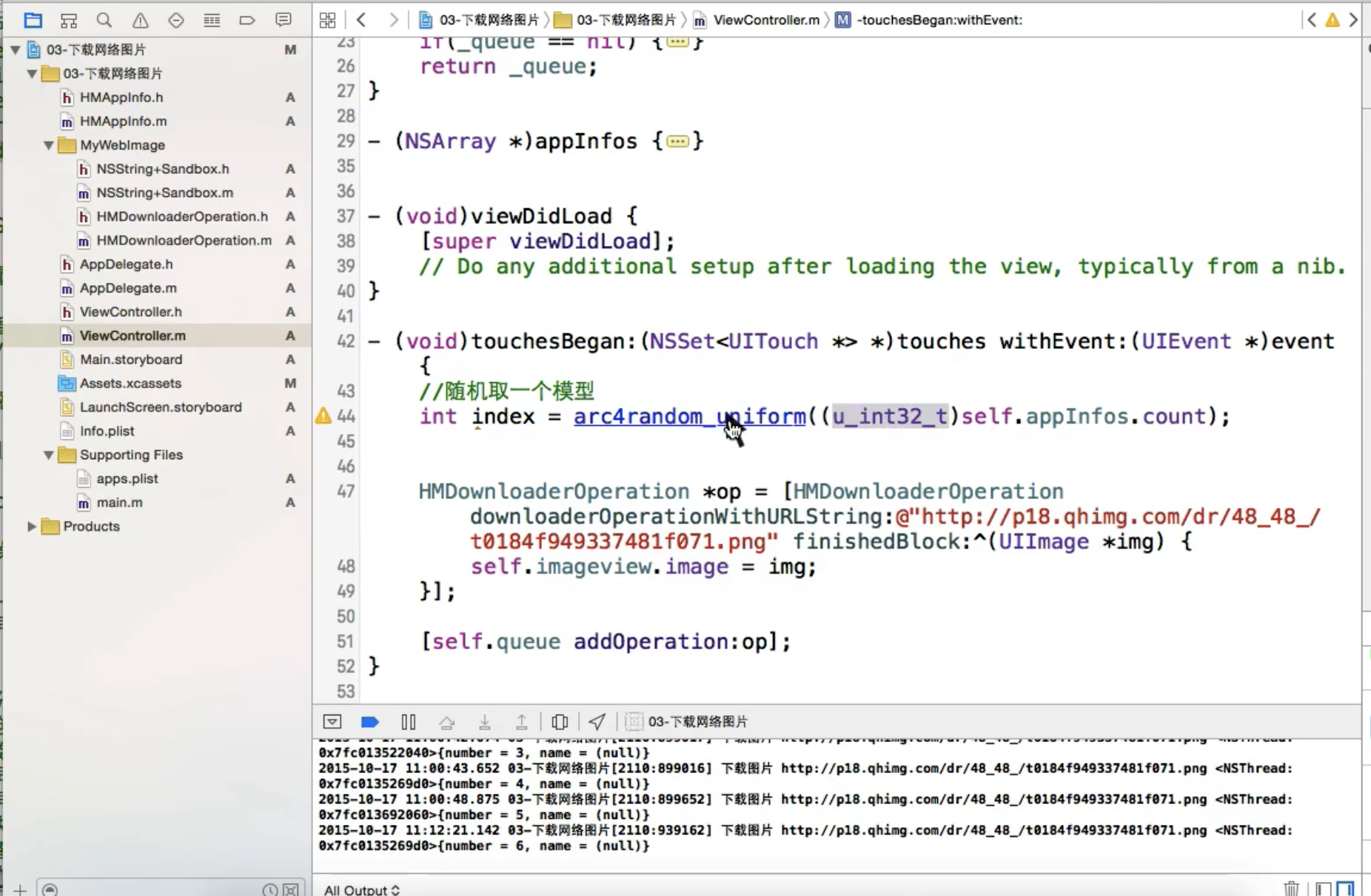 随机取一个模子,怎么写,我要从数组里边随机取一个模子,我先要天生一个下标, int index = arc4random_uniform(),随机数,它的范围是(0,你指定的这个数字),指定多少呢,别15、16了,self.appInfos.count,不应该出现死数的,死数,这儿写个15、16,那叫做硬编码,编程的时间只管制止硬编码,但是会有一个题目,
