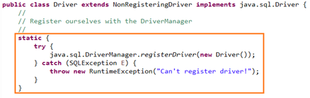 - 通常不用显式调用 DriverManager 类的 registerDriver() 方法来注册驱动程序类的实例,因为 Driver 接口的驱动程序类都包含了静态代码块,在这个静态代码块中,会调用 DriverManager.registerDriver() 方法来注册自身的一个实例。下图是MySQL的Driver实现类的源码:
