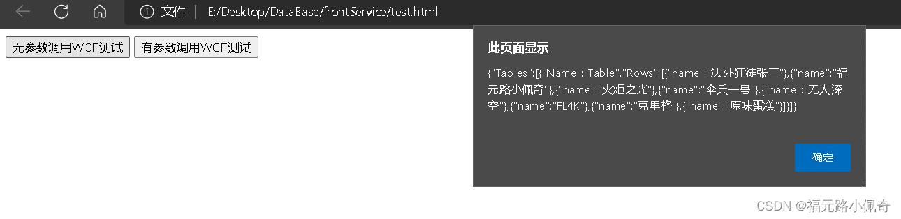 <authentication mode="Forms"/> <authentication mode="Forms"/> <authentication mode="Forms"/> <authentication mode="Forms"/> 跟前面一样,在浏览器中跑一下WCF服务,打开之前的HTML,点击 <authentication mode="Forms"/>无参数调用WCF测试 <authentication mode="Forms"/>,出现如下内容,说明已经读取到数据库中内容。
