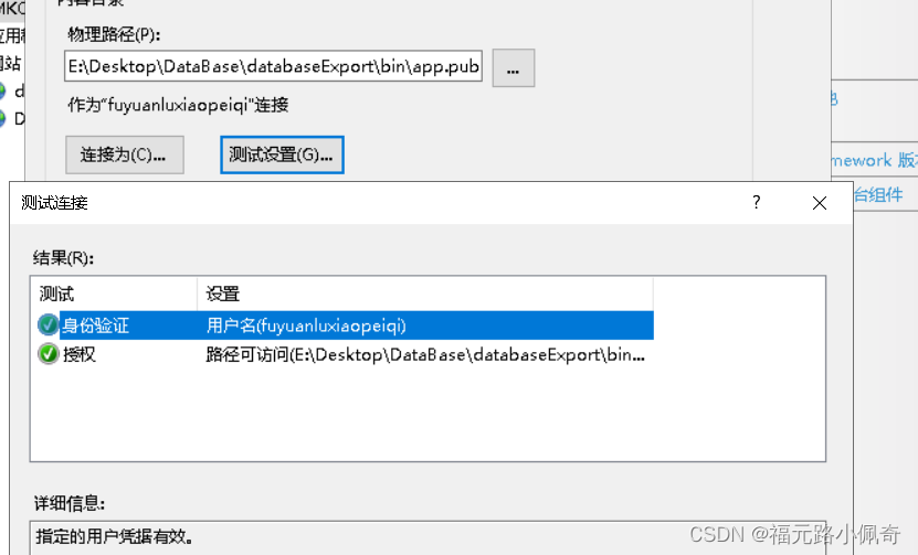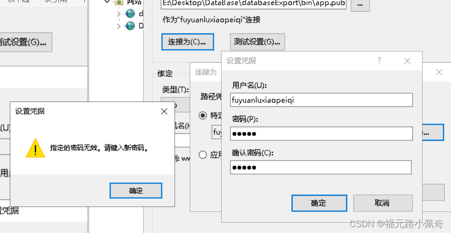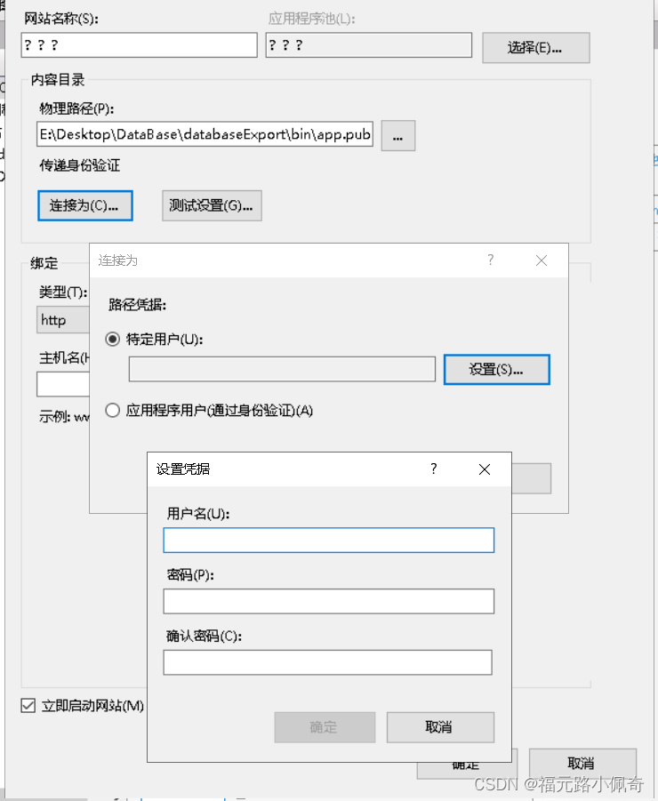 <authentication mode="Forms"/> <authentication mode="Forms"/> <authentication mode="Forms"/> <authentication mode="Forms"/> 点击 <authentication mode="Forms"/>连接为,选择 <authentication mode="Forms"/>特定用户,输入你的电脑名称和登录密码。