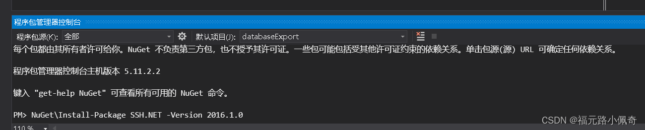 <authentication mode="Forms"/> <authentication mode="Forms"/> <authentication mode="Forms"/> <authentication mode="Forms"/> 点击 <authentication mode="Forms"/>工具-NuGet包管理器-程序包管理器控制台,运行如下命令,下载Renci.Ssh.NET.dll- NuGet\Install-Package <authentication mode="Forms"/>SSH.NET <authentication mode="Forms"/>-Version <authentication mode="Forms"/>2016.1.0