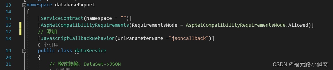 <authentication mode="Forms"/> <authentication mode="Forms"/> <authentication mode="Forms"/> <authentication mode="Forms"/>转到VS项目中之前创建的 <authentication mode="Forms"/>xxx.svc.cs文件中,添加如下两项。- [JavascriptCallbackBehavior(UrlParameterName <authentication mode="Forms"/>="jsoncallback")]