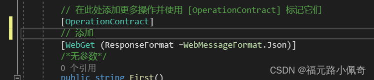 复制代码  编辑 <authentication mode="Forms"/> <authentication mode="Forms"/> <authentication mode="Forms"/> <authentication mode="Forms"/> 在 <authentication mode="Forms"/>[OperationContract] <authentication mode="Forms"/>下面编写函数。- <authentication mode="Forms"/>public <authentication mode="Forms"/>string <authentication mode="Forms"/>First() <authentication mode="Forms"/> <authentication mode="Forms"/> <authentication mode="Forms"/> <authentication mode="Forms"/> <authentication mode="Forms"/> <authentication mode="Forms"/> <authentication mode="Forms"/> <authentication mode="Forms"/>{ <authentication mode="Forms"/> <authentication mode="Forms"/> <authentication mode="Forms"/> <authentication mode="Forms"/> <authentication mode="Forms"/> <authentication mode="Forms"/> <authentication mode="Forms"/> <authentication mode="Forms"/> <authentication mode="Forms"/> <authentication mode="Forms"/> <authentication mode="Forms"/> <authentication mode="Forms"/>return <authentication mode="Forms"/>"OK"; <authentication mode="Forms"/> <authentication mode="Forms"/> <authentication mode="Forms"/> <authentication mode="Forms"/> <authentication mode="Forms"/> <authentication mode="Forms"/> <authentication mode="Forms"/> <authentication mode="Forms"/>} <authentication mode="Forms"/> <authentication mode="Forms"/> <authentication mode="Forms"/> <authentication mode="Forms"/> <authentication mode="Forms"/> <authentication mode="Forms"/> <authentication mode="Forms"/> <authentication mode="Forms"/>[OperationContract] <authentication mode="Forms"/> <authentication mode="Forms"/> <authentication mode="Forms"/> <authentication mode="Forms"/> <authentication mode="Forms"/> <authentication mode="Forms"/> <authentication mode="Forms"/> <authentication mode="Forms"/>[WebInvoke(Method <authentication mode="Forms"/>="GET",BodyStyle <authentication mode="Forms"/>=WebMessageBodyStyle.WrappedRequest, <authentication mode="Forms"/> <authentication mode="Forms"/> <authentication mode="Forms"/> <authentication mode="Forms"/> <authentication mode="Forms"/> <authentication mode="Forms"/> <authentication mode="Forms"/> <authentication mode="Forms"/> <authentication mode="Forms"/> <authentication mode="Forms"/> <authentication mode="Forms"/> <authentication mode="Forms"/>ResponseFormat <authentication mode="Forms"/>= <authentication mode="Forms"/>WebMessageFormat.Json, <authentication mode="Forms"/>RequestFormat <authentication mode="Forms"/>= <authentication mode="Forms"/>WebMessageFormat.Json)] <authentication mode="Forms"/> <authentication mode="Forms"/> <authentication mode="Forms"/> <authentication mode="Forms"/> <authentication mode="Forms"/> <authentication mode="Forms"/> <authentication mode="Forms"/> <authentication mode="Forms"/>/*有参数*/ <authentication mode="Forms"/> <authentication mode="Forms"/> <authentication mode="Forms"/> <authentication mode="Forms"/> <authentication mode="Forms"/> <authentication mode="Forms"/> <authentication mode="Forms"/> <authentication mode="Forms"/>public <authentication mode="Forms"/>string <authentication mode="Forms"/>Second(string <authentication mode="Forms"/>name) <authentication mode="Forms"/> <authentication mode="Forms"/> <authentication mode="Forms"/> <authentication mode="Forms"/> <authentication mode="Forms"/> <authentication mode="Forms"/> <authentication mode="Forms"/> <authentication mode="Forms"/>{ <authentication mode="Forms"/> <authentication mode="Forms"/> <authentication mode="Forms"/> <authentication mode="Forms"/> <authentication mode="Forms"/> <authentication mode="Forms"/> <authentication mode="Forms"/> <authentication mode="Forms"/> <authentication mode="Forms"/> <authentication mode="Forms"/> <authentication mode="Forms"/> <authentication mode="Forms"/>string <authentication mode="Forms"/>msg <authentication mode="Forms"/>= <authentication mode="Forms"/>string.Format("{0}success",name); <authentication mode="Forms"/> <authentication mode="Forms"/> <authentication mode="Forms"/> <authentication mode="Forms"/> <authentication mode="Forms"/> <authentication mode="Forms"/> <authentication mode="Forms"/> <authentication mode="Forms"/> <authentication mode="Forms"/> <authentication mode="Forms"/> <authentication mode="Forms"/> <authentication mode="Forms"/>return <authentication mode="Forms"/>msg; <authentication mode="Forms"/> <authentication mode="Forms"/> <authentication mode="Forms"/> <authentication mode="Forms"/> <authentication mode="Forms"/> <authentication mode="Forms"/> <authentication mode="Forms"/> <authentication mode="Forms"/>}