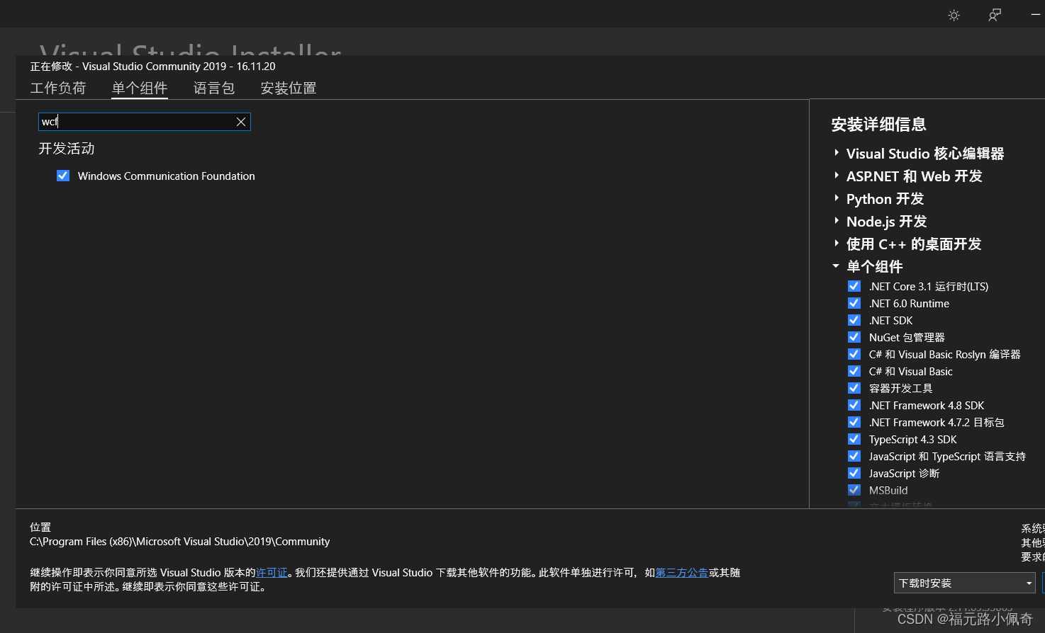 进入到 C:\Program <authentication mode="Forms"/>Files <authentication mode="Forms"/>(x86)\Microsoft <authentication mode="Forms"/>Visual <authentication mode="Forms"/>Studio\Installer 文件夹下,打开 <authentication mode="Forms"/>vs_installer.exe。修改VS2019,点击单个组件,搜索WCF并下载安装。