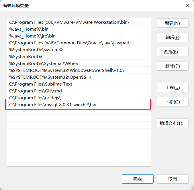 3.编辑path变量,添加MySQL安装目录下bin文件的路径,我这里是C:\Program Files\C:\Program Files\mysql-8.0.31-winx64\bin