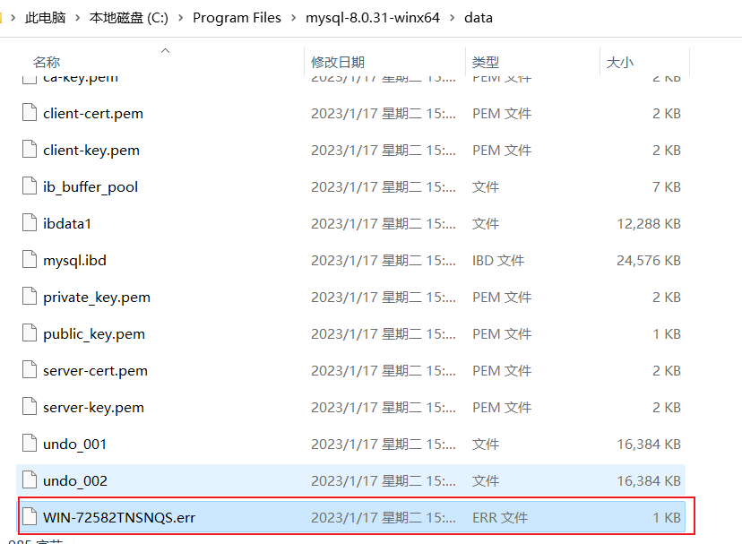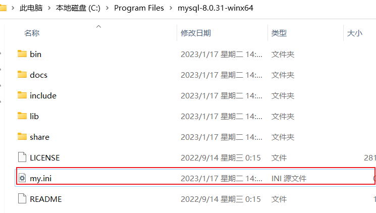 1.解压压缩包到你想安装的路径,我这里解压的路径为C:\Program Files\C:\Program Files\mysql-8.0.31-winx64,压缩包内文件如下: