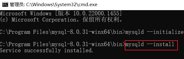 6. 在命令行窗口输入mysqld --install命令,安装mysql服务。