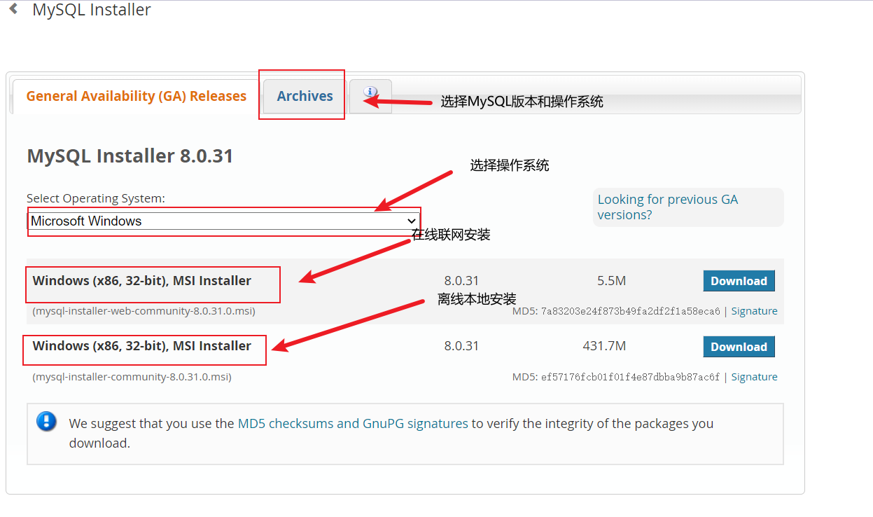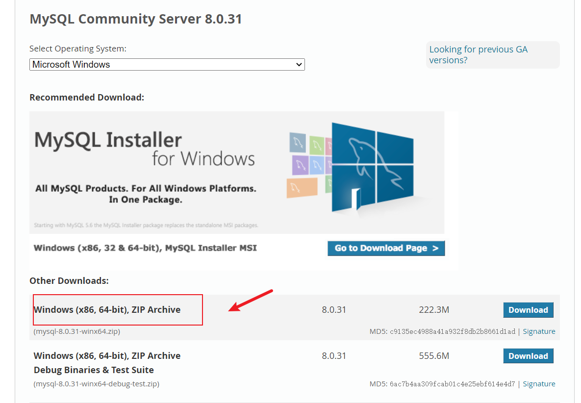 还有一种压缩包下载方式,网址:https://dev.mysql.com/downloads/mysql/5.5.html#downloads