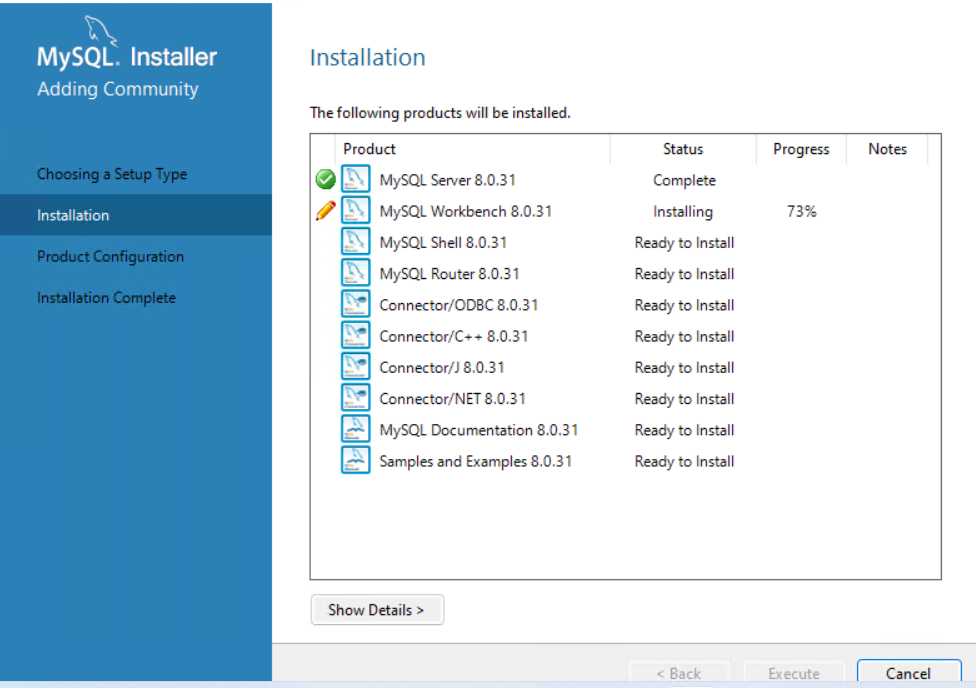 - 展示安装MySQL的要求,你不满足的话,按钮是Execute,。反之,则是next,点击中间按钮即可。