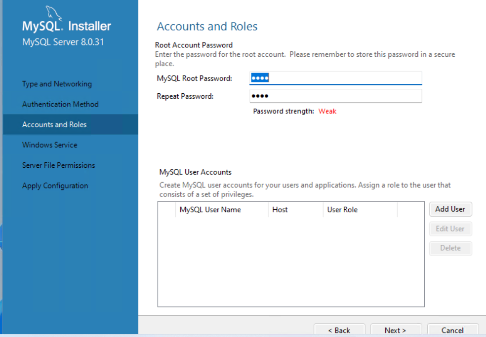- 然后输入 MySQL 的 root 密码,设置完密码之后点击next。