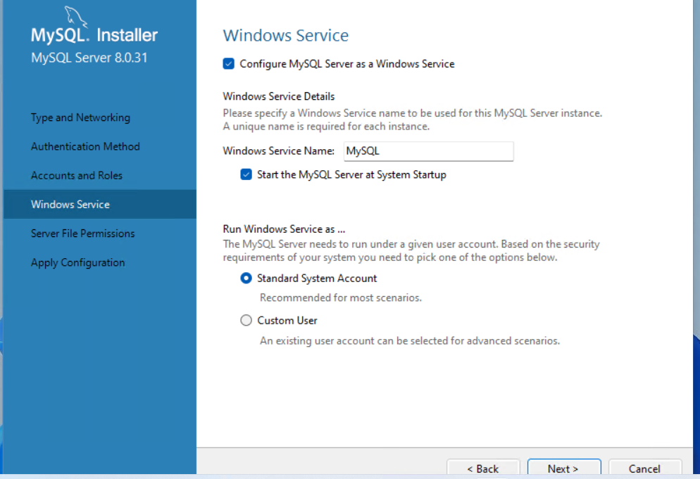 - 这里服务名称默认为 MySQL80,我改了服务名为MySQL,点击next。