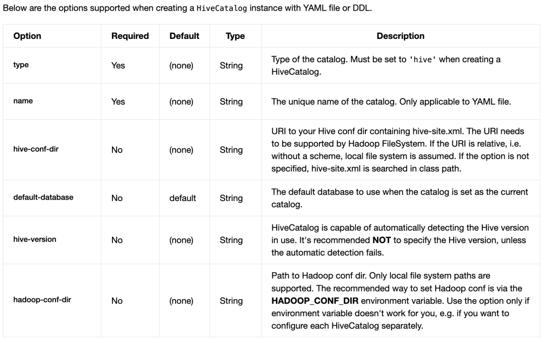 • Hive Catalog:作为原生 Flink 元数据的持久化存储,以及作为读写现有 Hive 元数据的接口