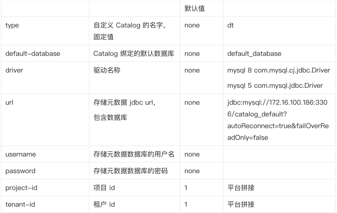 JDBC Catalog 支持以下参数: