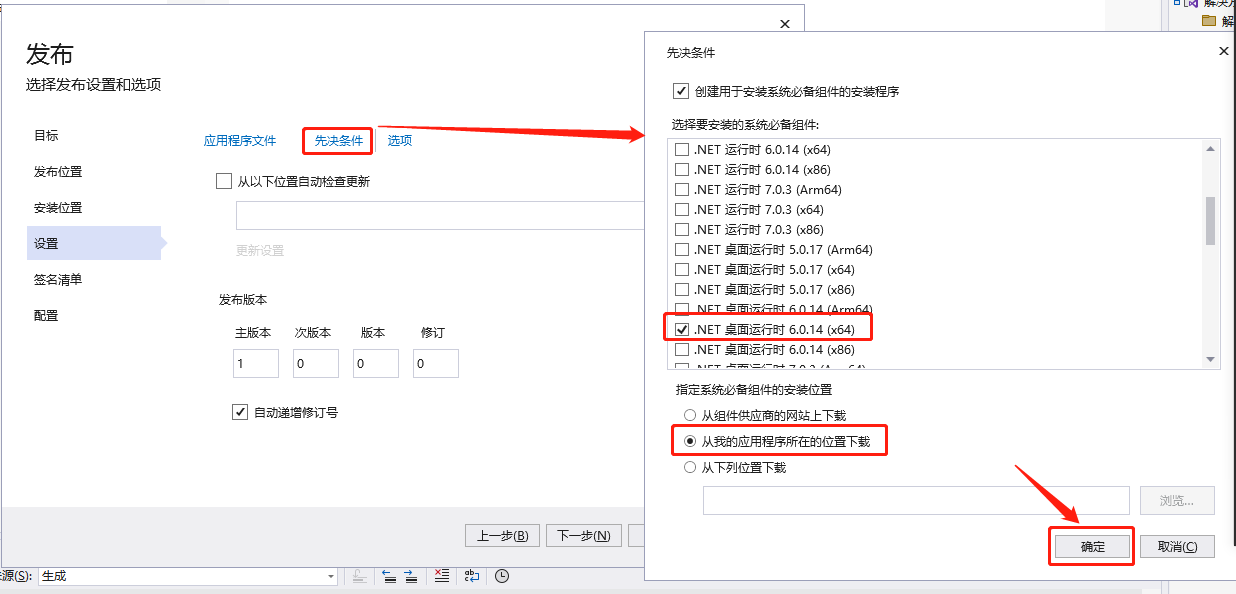 要在“系统必备”对话框中启用“从与我的应用程序相同的位置下载系统必备组件”,必须将“.NET 桌面运行时 6.0.14 (x64)”项的文件“net6desktopruntime_x64\windowsdesktop-runtime-6.0.14-win-x64.exe”下载到本地计算机。