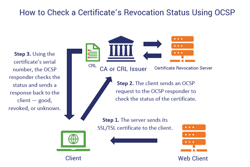 因此,现在基本都是使用 OCSP ,名为在线证书状态协议(Online Certificate Status Protocol)来查询证书的有效性,它的工作方式是向 CA 发送查询请求,让 CA 返回证书的有效状态。 不必像 CRL 方式客户端需要下载大大的列表,还要从列表查询,同时因为可以实时查询每一张证书的有效性,解决了 CRL 的实时性问题。
