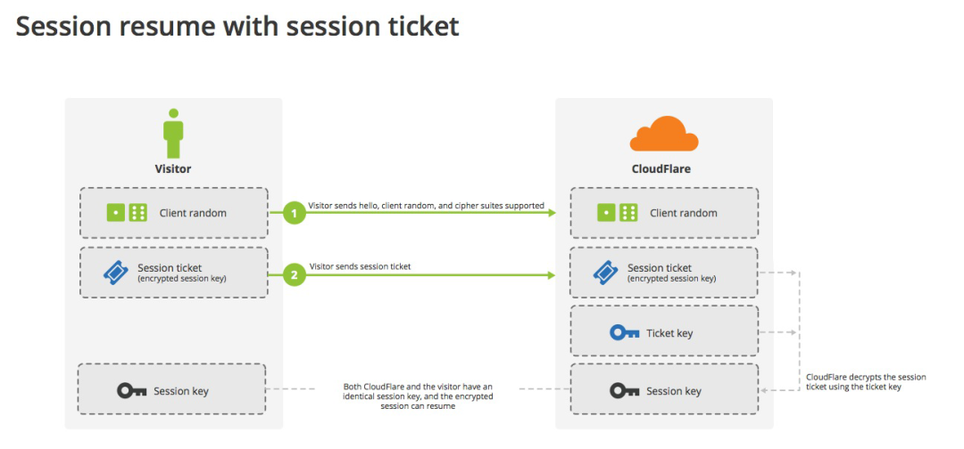 为了解决 Session ID 的问题,就出现了 Session Ticket,服务器不再缓存每个客户端的会话密钥,而是把缓存的工作交给了客户端,类似于 HTTP 的 Cookie。