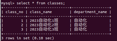 - insert into classes values(3,'2023自动化3班','自动化');