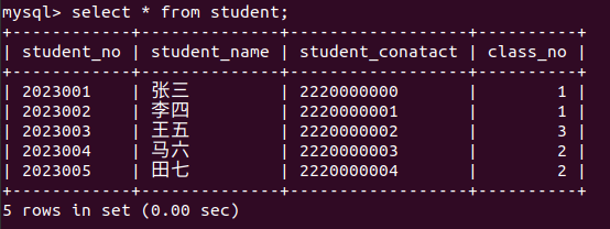 复制代码 向学生表批量插入:- insert into student values('2023001','张三','2220000000',1),('2023002','李四','2220000001',1),('2023003','王五','2220000002',3),('2023004','马六','2220000003',2),('2023005','田七','2220000004',2);