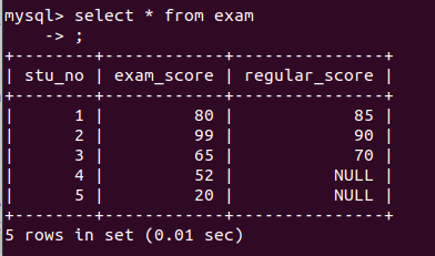 - insert into exam values(null,80,85),(null,99,90),(null,65,70),(null,52,null),(null,20,null);