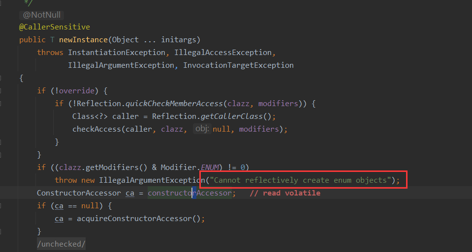 - //(newInstance 源码)正常报错是:throw new IllegalArgumentException("Cannot reflectively create enum objects");