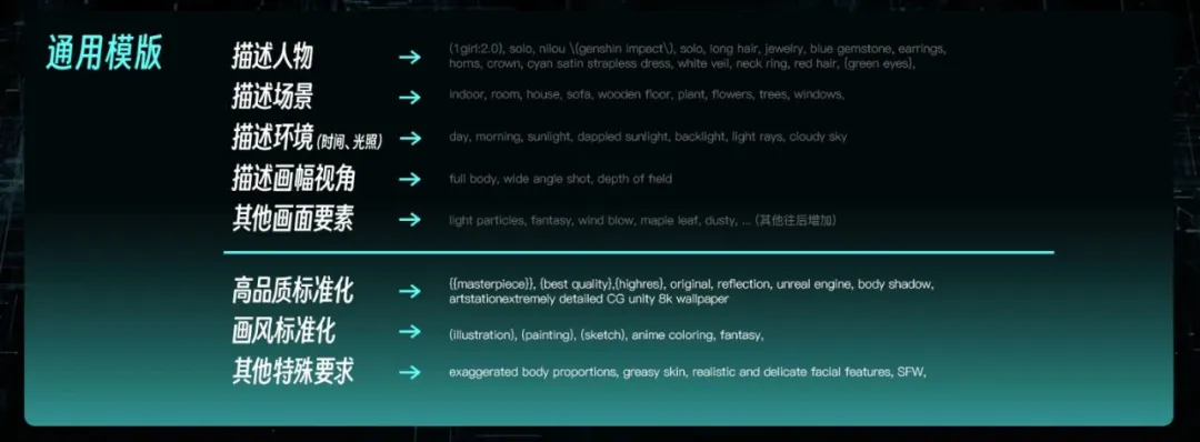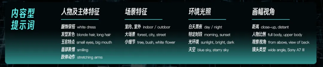 1、正向提示词的内容通常包罗人物、场景、环境、视角以及画面风致和画风等根本元素构成