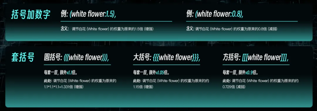 增长权重:(white flower:1.5) 会增长白色的花在画面中出现的概率和画面占比