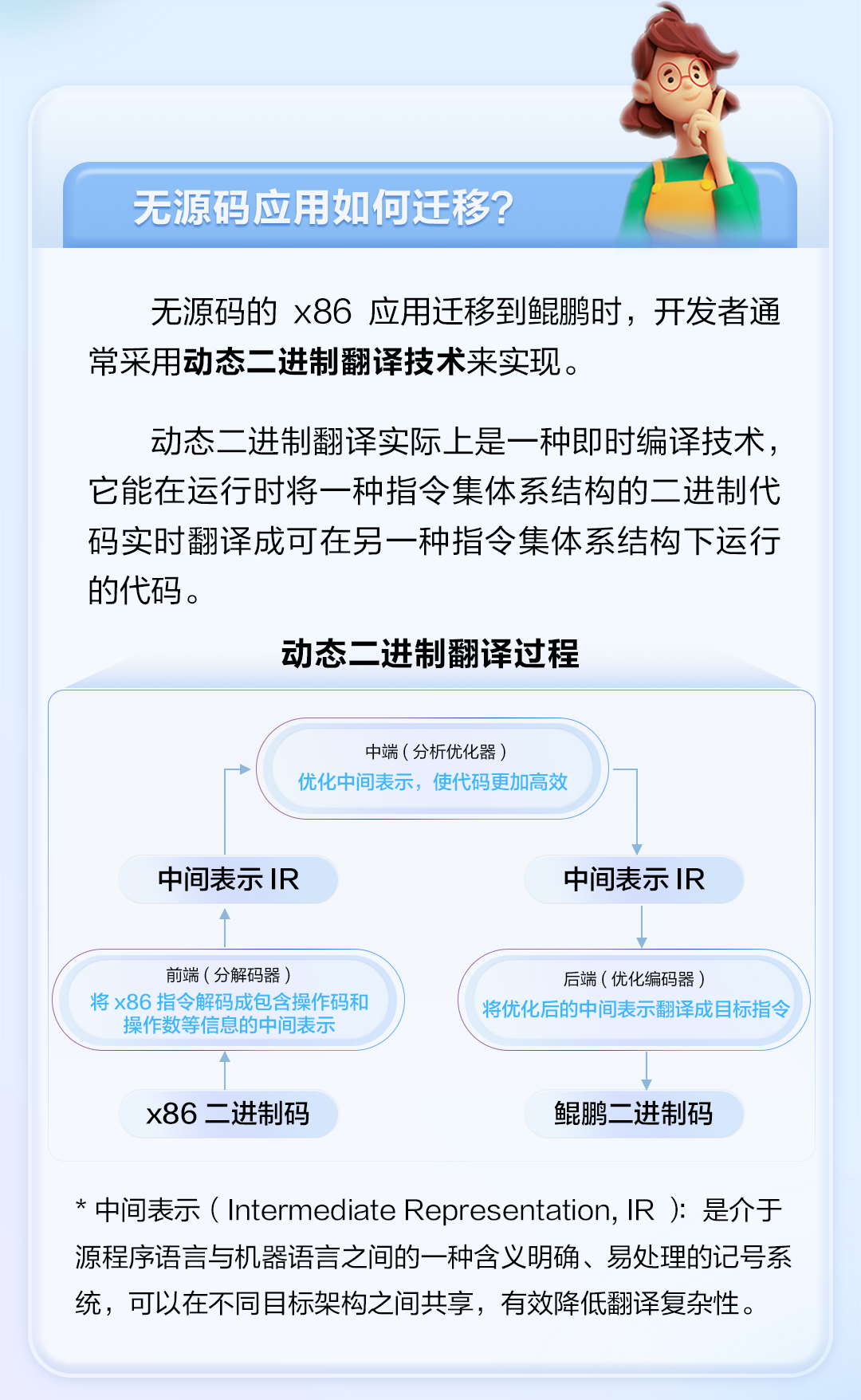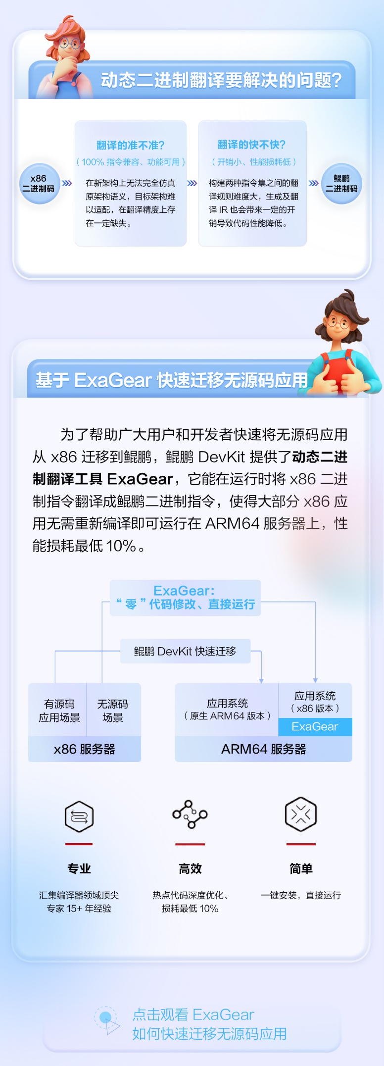 为了帮助广大用户和开发者快速将无源码应用从 x86 迁移到鲲鹏,鲲鹏 DevKit提供了动态二进制翻译工具ExaGear,它能在运行时将x86二进制指令翻译成鲲鹏二进制指令,使得大部分x86应用无需重新编译即可运行在 ARM64