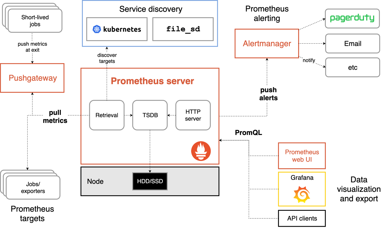 数据按照时间序列的方式存储在本地磁盘当中(Prometheus Server本身也是一个时序数据库);并支持通过PromQL和通过API Client对数据进行查询; 它还负责通过服务发现或者静态配置的方式来识别监控目标。