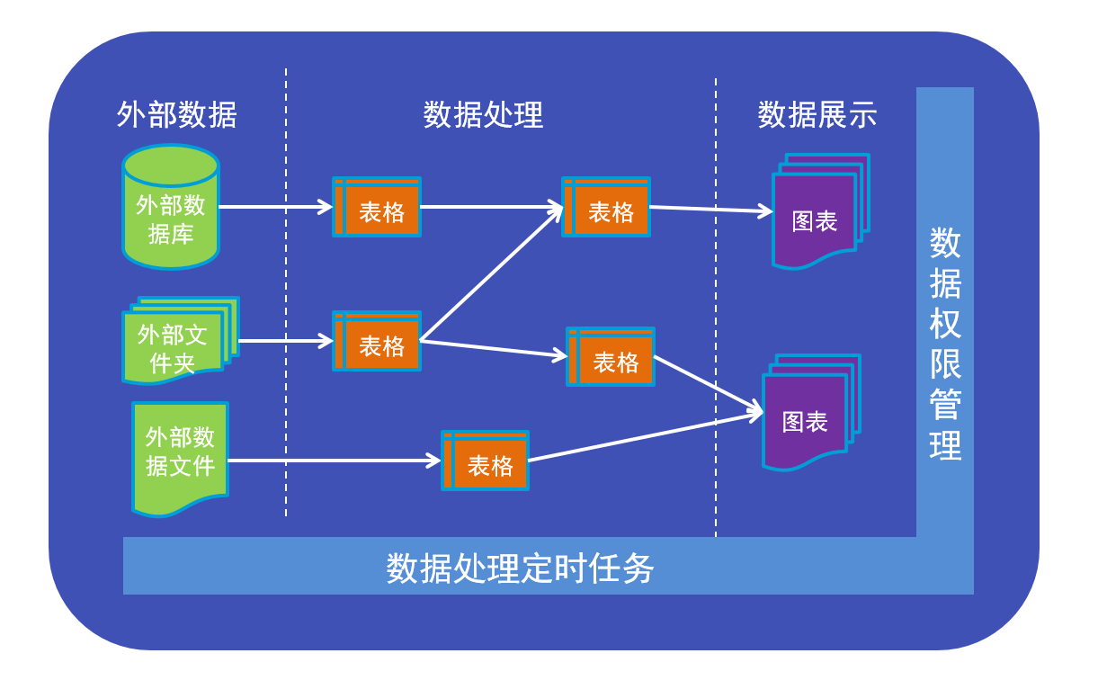 通过操作表格进行手动数据处理,这些操作也可设置为后台任务,按指定的时间或频率执行。可以每天晚上增量抓取外部数据库中的数据,也可以将复杂的计算任务提前算好,报表查询就可以非常快了。