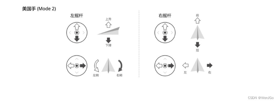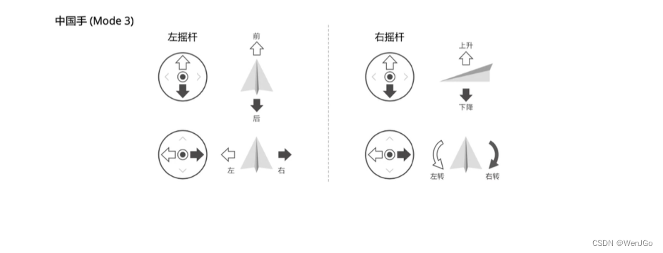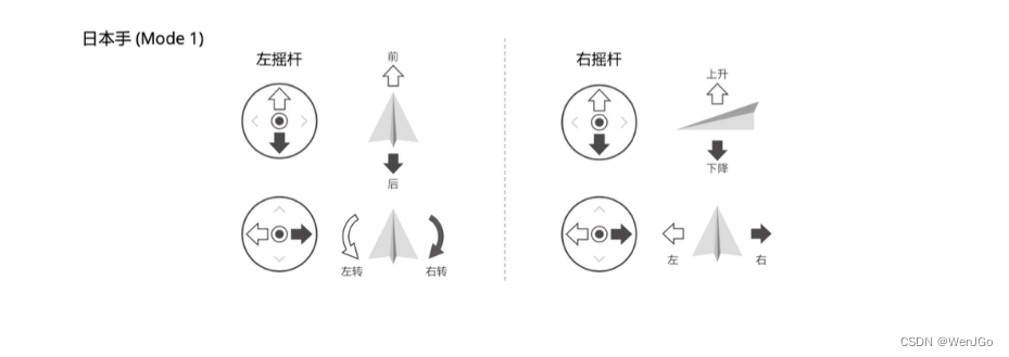 日本手左摇杆控制航空器前后移动、左转右转;右摇杆控制航空器上起落落、左右移动,参考下图: