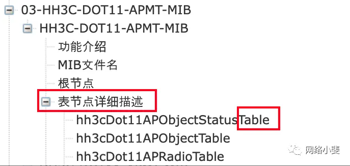 表量如下所示,一般都会说明表节点,oid对象往往都是以Table结尾,里面有以该表的唯一索引的一批具体oid指标对象: