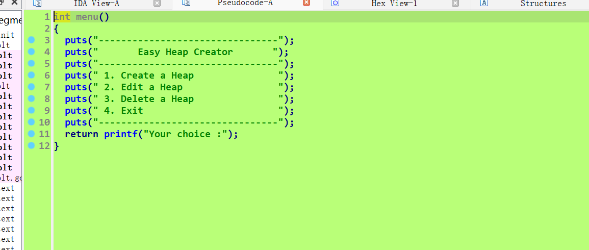 非常典型的菜单题,接着分析每一个函数的作用- unsigned __int64 create_heap()