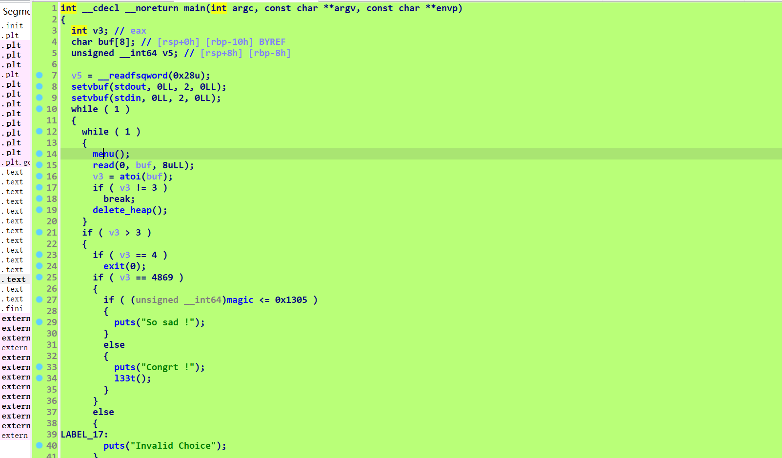 def delete(index): io.recvuntil(b"Your choice :") io.sendline(str(3)) io.recvuntil(b"Index :") io.send(str(index)) io.recvuntil("Done !\n")