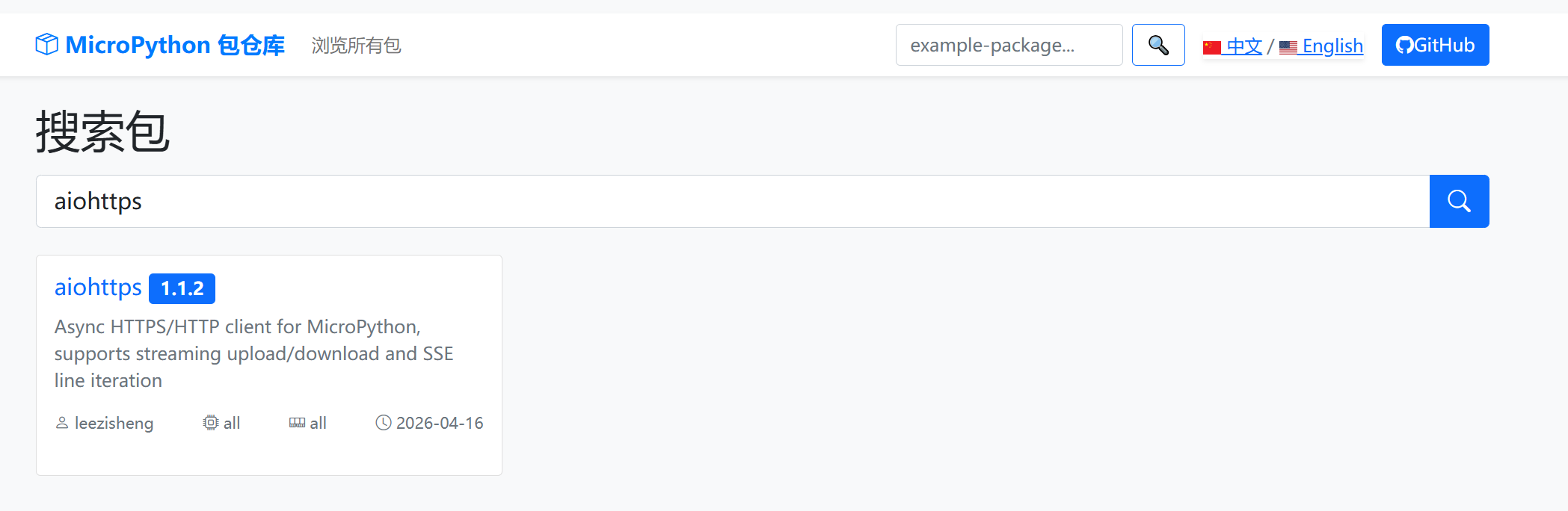 这里,各人在uPyPI(https://upypi.net/)中搜刮aiohttps: