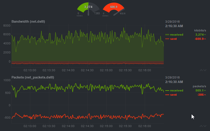 再来看看监控页面,除了配色酷炫,监控项种类繁多之外,页面元素的实时响应、告警设置等都极具亮点。为了更好的展示页面,在这里会盗用github上netdata官方的几个动态图来show一下.