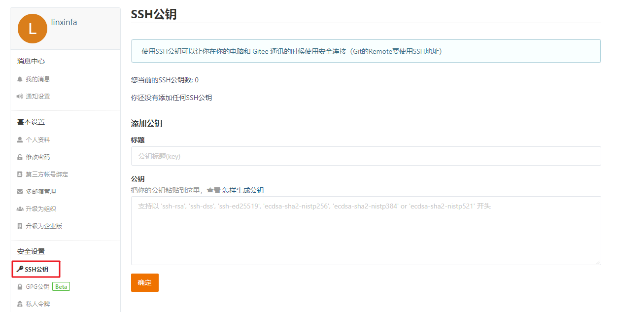 由于我们的本地 git仓库和 gitee仓库之间的传输是通过SSH加密的,所以我们需要配置SSH公钥。