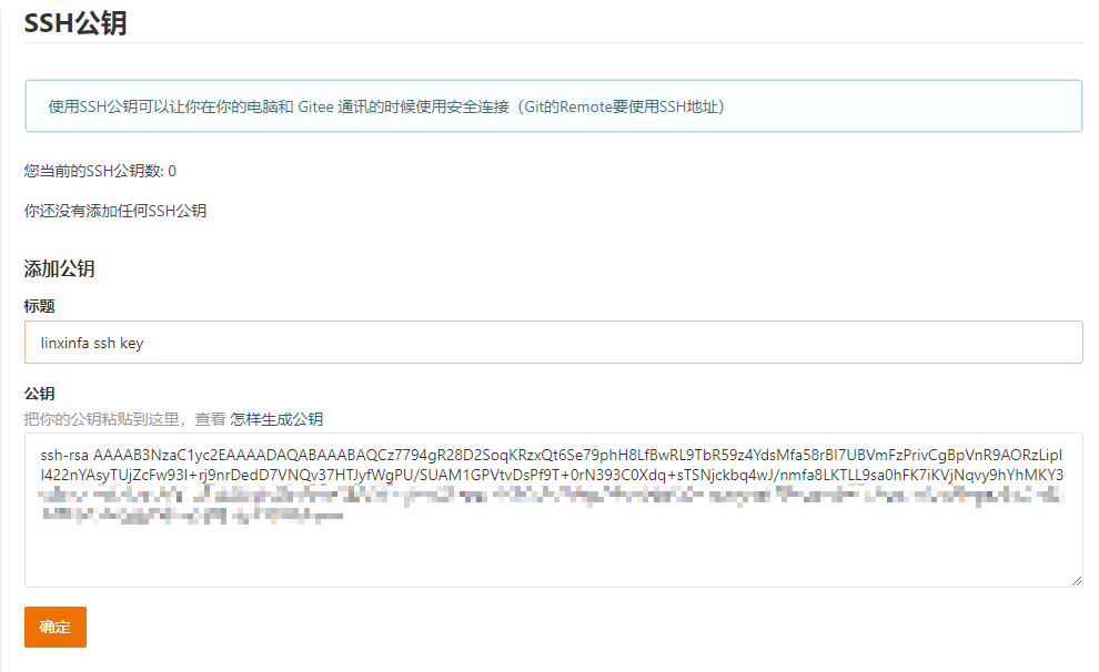 输入公钥标题,拷贝刚刚的SSH公钥到框中,点击确定