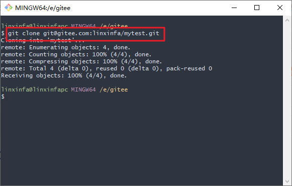 - git clone git@gitee.com:linxinfa/mytest.git