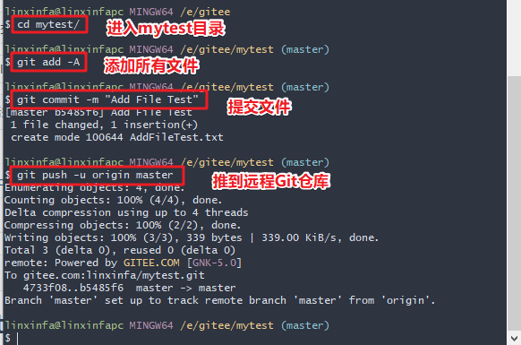 - git remote add origin git@gitee.com:linxinfa/mytest.git