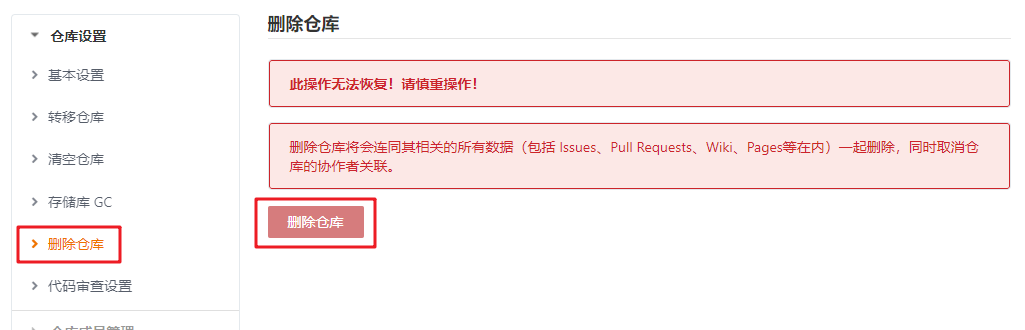 点击删除仓库,根据提示输入密码即可