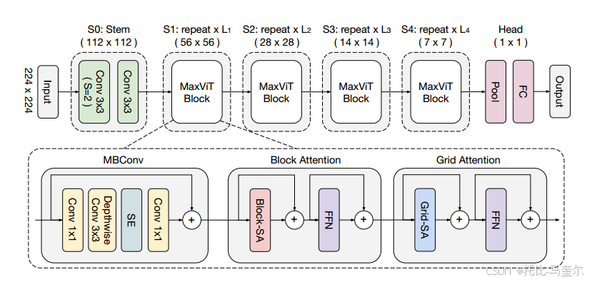 :MaxViT通过将Max-SA模块与MBConv(MobileNetV2中的深度可分离卷积变体)瓜代堆叠在一个层次结构中,形成了一种新奇的模型结构。