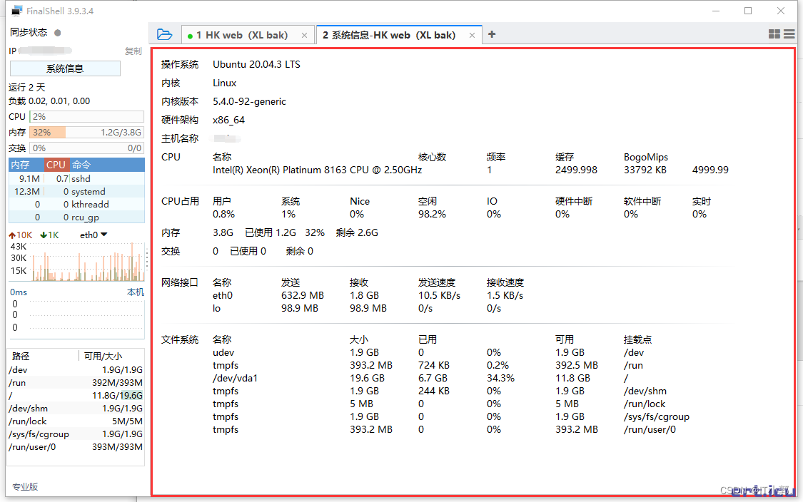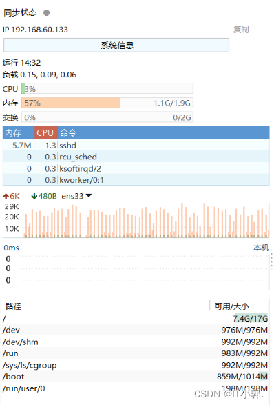 - 系统信息按钮,点击后会显示出系统相关的信息,包罗系统硬件信息,服务器负载信息,网络接口信息及流量,文件系统及用量等。