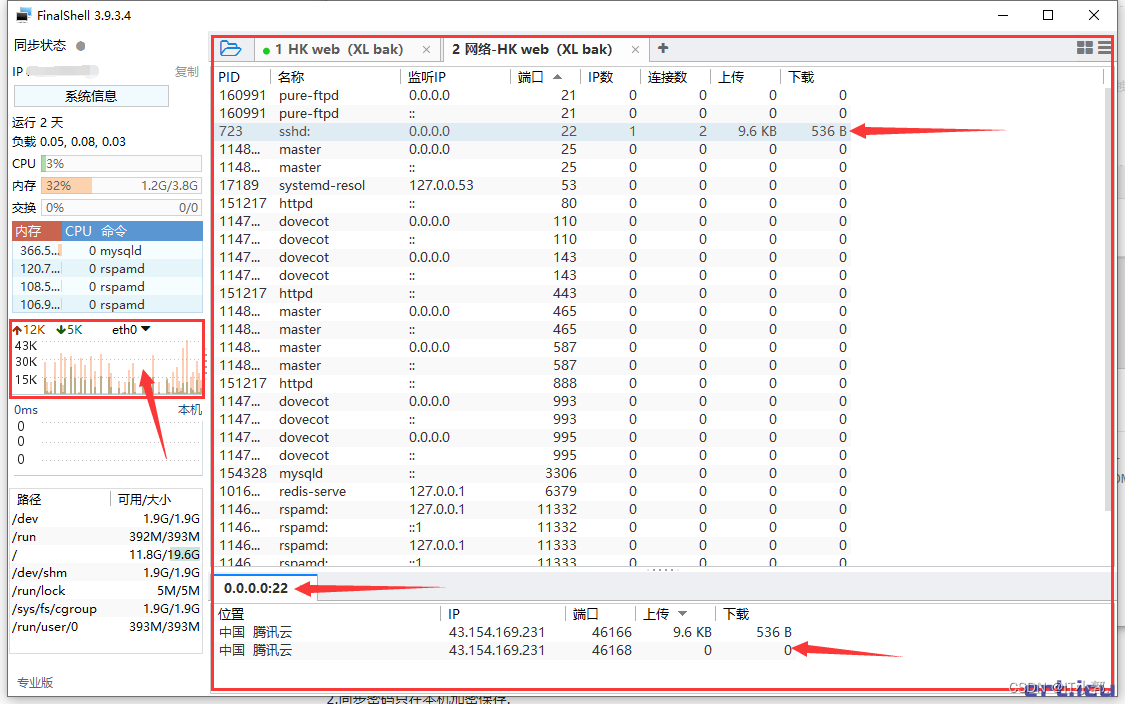 - 网络,右边会显示出网络的详细信息。点击对应的信息,下面会显示出这个连接详细的接入信息,可以显示出有哪些IP连接到这个端口上,方便检查服务器是不是有被其它人连接。这一步需要使用root权限来举行连接,如果使用root连接进来以后,这里显示的是白屏,那就要看一下,服务器上是否安装有ss命令和netstat命令,如果没有安装上就可以。具体的安装文件,我将另开博文分析,不在这里赘述。