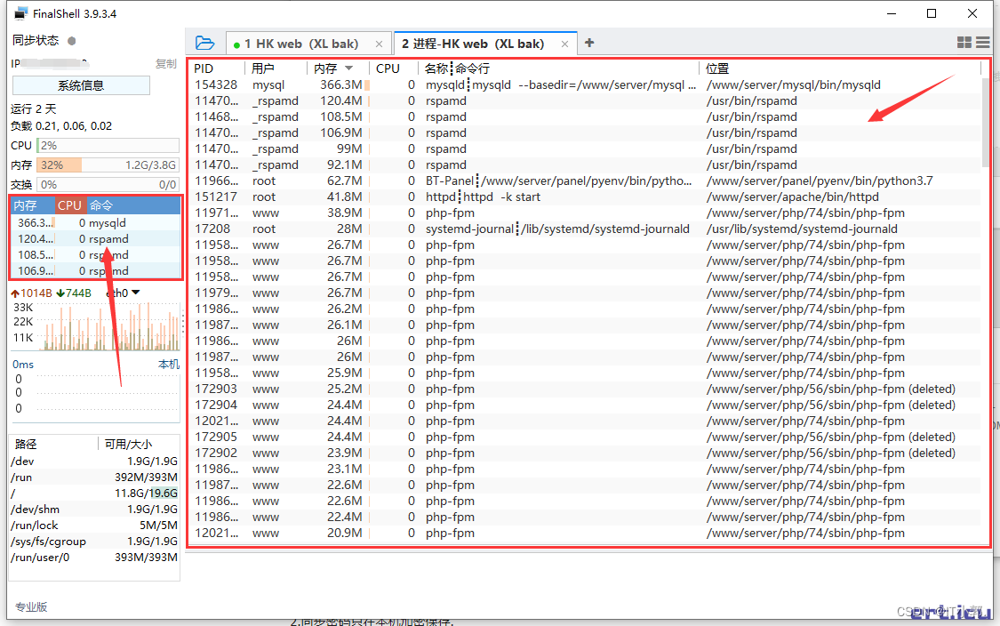 - 进程,点击左边的进程页面,右边会显示出进程与相邻的木面,可以查看PID 用户 内存 CPU 命令行等等内容。点击对应的进程,下边会显示出这个进程的详细信息,包罗所在目录,启动命令等。